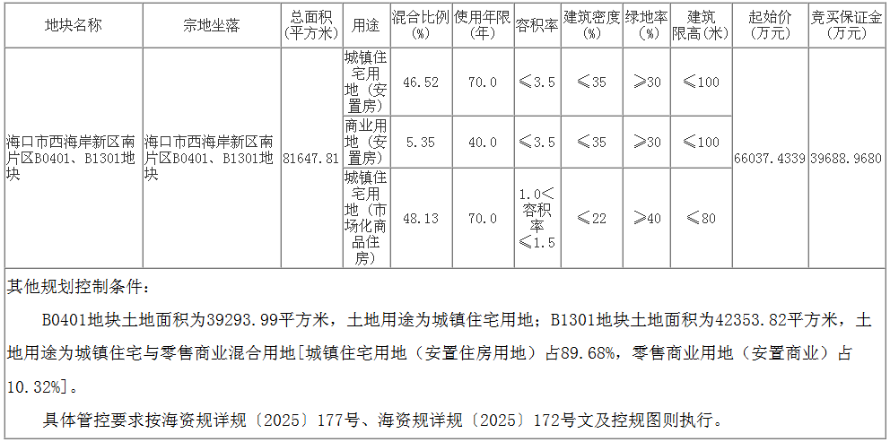(一)按照《海南省产业用地控制指标》(琼自然资用〔2023〕12号)有关规定,该地块设定出让控制指标,具体如下: