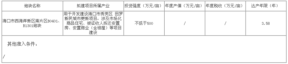 (二)根据秀英区人民政府提供的准入协议,项目达产时,B0401地块在约定达产时间内固定资产投资总额(工业用地包含房地产、设备的所有投资总额,其他用地为扣除土地出让价款之外的所有投资总额,均不含有关税费)不低于29470万元人民币(项目用地投资强度不低于500万元/亩),项目达产时间为竣工验收合格后6个月内;B1301地块在约定达产时间内的固定资产投资总额不低于31765万元人民币(项目用地投资强度不低于500万元/亩),项目达产时间为竣工验收合格后6个月内。以上控制指标按规定列入《产业项目发展和用地准入协议》,属于协议内容的组成部分。