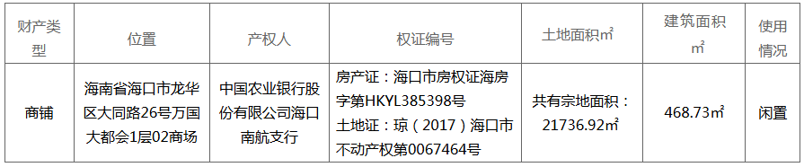 资产位于海南省海口市龙华区大同路26号万国大都会1层02商场,产权证号为:海口市房权证海房字第HKYL385398号,建筑面积为468.73平方米,竣工日期2008年,取得方式为购买,地类为商业用地,终止日期为2062年。