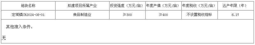 1.该宗地为食品加工项目用地,产业类型为食品制造业。该宗地投资强度不低于300万元/亩,年度产值不低于400万元/亩,不设置税收指标。以上出让指标列入《海南省产业项目发展和用地准入协议》,属该协议内容的组成部分。