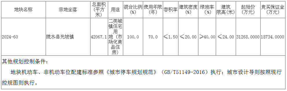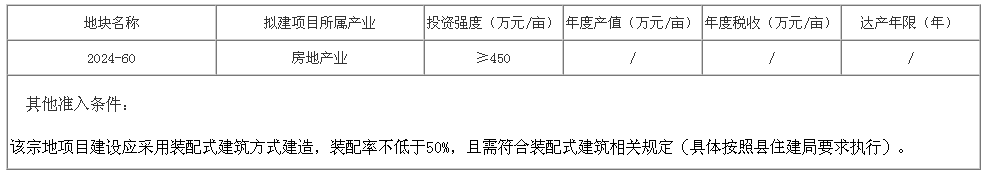 2.该宗地用地出让控制标准和用地准入协议按照海南省自然资源和规划厅、海南省发展和改革委员会等《关于印发〈海南省产业用地控制指标〉的通知》(琼自然资用〔2023〕12号)和《关于实施产业项目发展和用地准入协议的指导意见》(琼国土资规〔2018〕8号)有关规定执行,该宗用地不在海南自由贸易港重点园区范围内,根据县住建局《关于报送2024-60号宗地招商引资情况及竞买资格条件的函》(陵建函〔2025〕52号),该宗地拟建项目属于房地产业。投资强度指标设定为不低于450万元/亩,不设年度产值和税收指标,项目投资总额不低于28395万元,竞得人在项目建成前,不得以转让、出租等任何形式转移土地使用权,不得以股权变更等形式变相转移土地使用权。宗地上建设的住宅房屋执行现房销售政策。