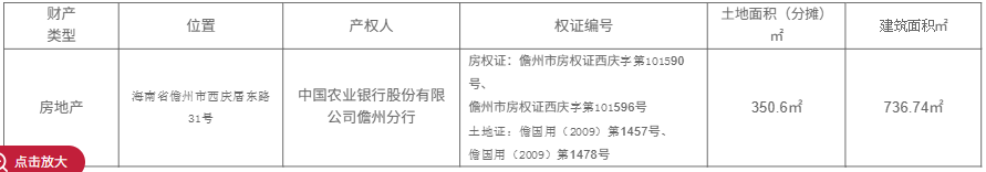 资产位于海南省儋州市西庆居东路31号,房权证:房权证:儋州市房权证西庆字第101590号、儋州市房权证西庆字第101596号,土地证:儋国用(2009)第1457号、 儋国用(2009)第1478号,上述房产产权人为中国农业银行股份有限公司儋州分行,中国农业银行股份有限公司儋州分行(转让方)享有该房产的处置权利。