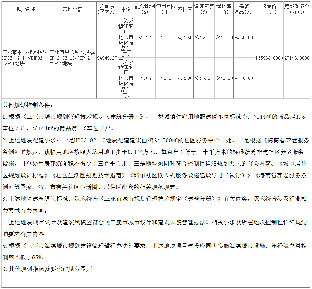 7.该幅用地竞得人需按照控规要求,在HP02-02-14、HP02-02-17地块内,配建建筑面积不小于241859㎡的安置房(最终面积以实际控规批复文件为准),预计建设费用157595万元;在HP02-02-13地块内,配建1处建筑面积不小于2961㎡的幼儿园,预计建设费用2368.5万元;在HP02-02-16地块内,配建1处建筑面积不小于168㎡的环卫设施,预计建设费用117.5万元。上述配建项目总金额不低于160081万元,竞得人须与三亚市天涯区人民政府或其指定单位签订具体配建协议,配建项目建成后无偿移交给天涯区人民政府或其指定单位。同时,竞得人须自控规HP02-02-14、HP02-02-17地块土地交接之日起24个月内,完成上述安置房全部建设工作,并在竣工验收合格后配合办理相关交付及不动产登记手续,如未按期完成安置房建设或移交,须承担相关违约责任。