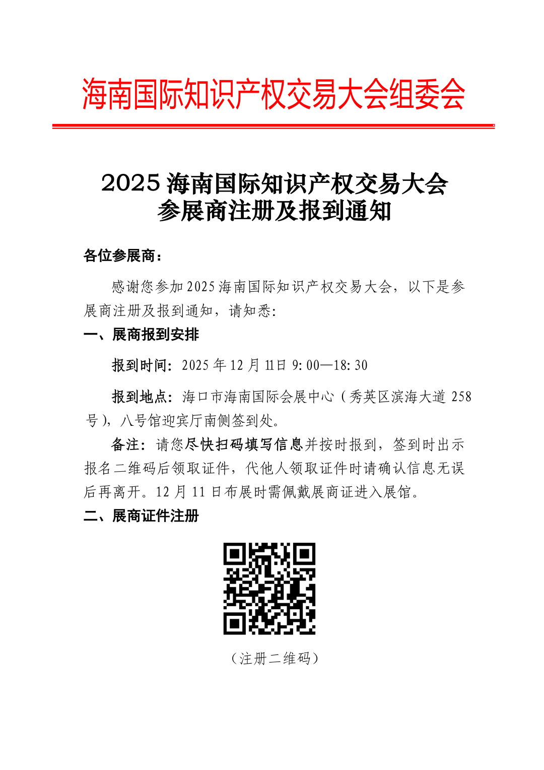欢迎参加2025海南国际知识产权交易大会!为保障大会顺利进行,现将参展商报到相关安排通知如下,请务必仔细阅读并提前准备。